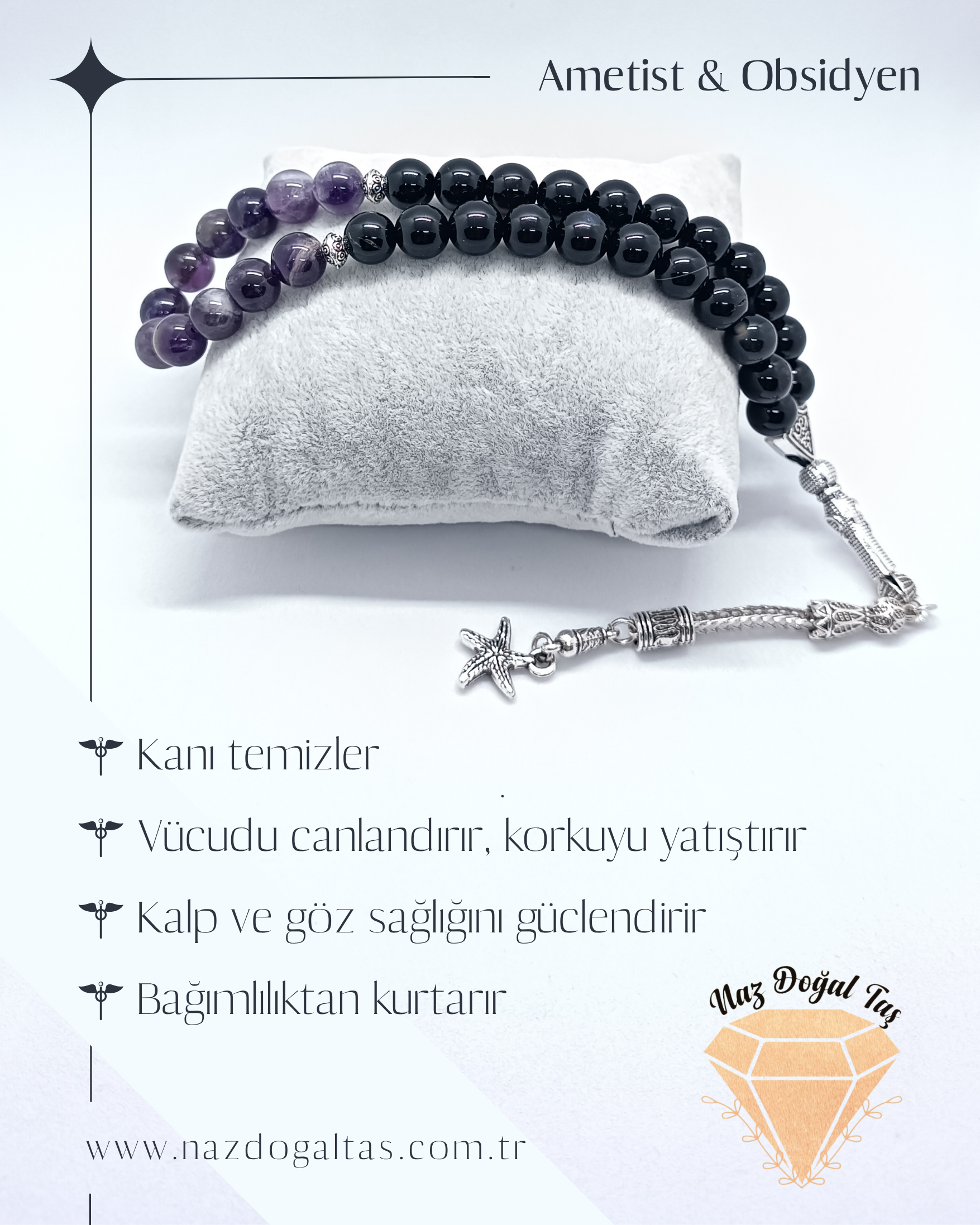 Obsidyen taşı, negatif enerjileri uzaklaştırma ve koruyucu kalkan oluşturma özellikleriyle bilinirken; ametist, zihinsel berraklık, huzur ve ruhsal denge sağlayan bir taş olarak yüzyıllardır değer görmektedir. Bu iki güçlü taşın birleşimiyle oluşturulan tesbihimiz, hem estetik hem de manevi açıdan eşsiz bir aksesuar sunar.